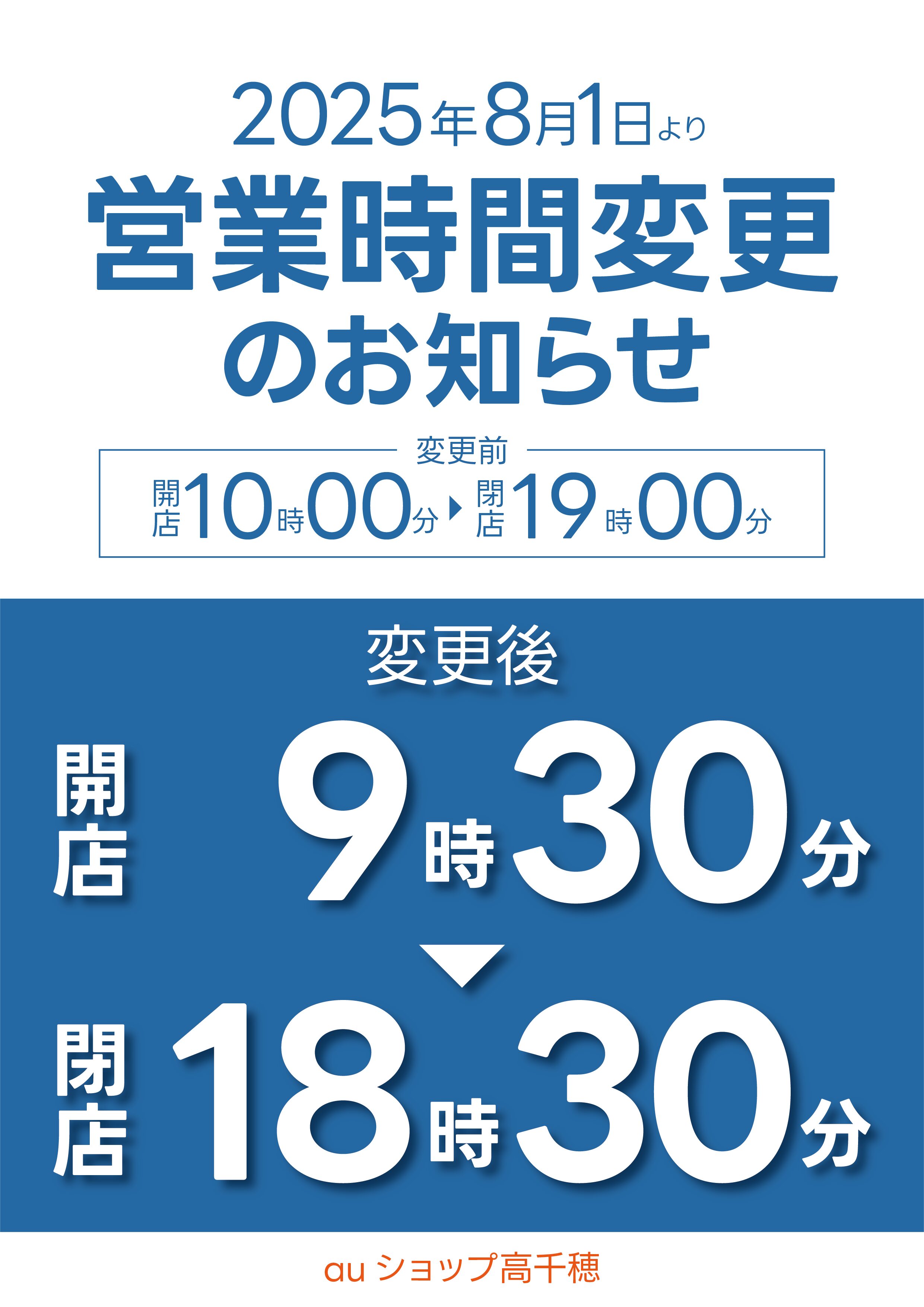 auショップ高千穂 2025年8月1日より営業時間が変更になります。 2025 6/29 お知らせ 2025年6月29日 姉妹店のauショップ高千穂の営業時間変更のお知らせです。※au延岡多々良は今まで通りの営業時間です。 お知らせ auショップ高千穂 au高千穂 お知らせ 営業時間変更 よかったらシェアしてね! URLをコピーしました! URLをコピーしました! 2025年7月の店休日について スマホお困り事解決イベントを開催します! in ホームワイド高千穂 関連記事 2025年12月の店休日について 2025年11月25日 2025年11月の店休日について 2025年10月25日 2025年10月の店休日について 2025年9月25日 2025年9月の店休日について 2025年8月25日 2025年8月の店休日について 2025年7月25日 2025年7月の店休日について 2025年6月25日 2025年6月の店休日について 2025年5月25日 auショップ高千穂店 時短営業のお知らせ 6/17 6/28 2025年5月17日